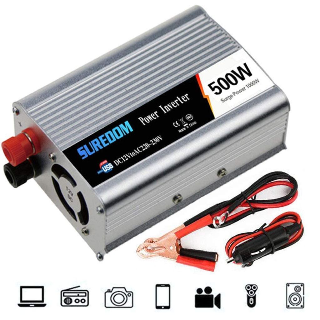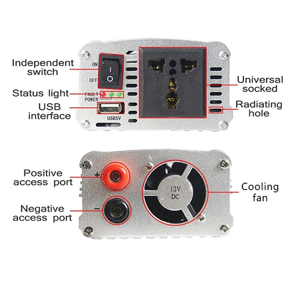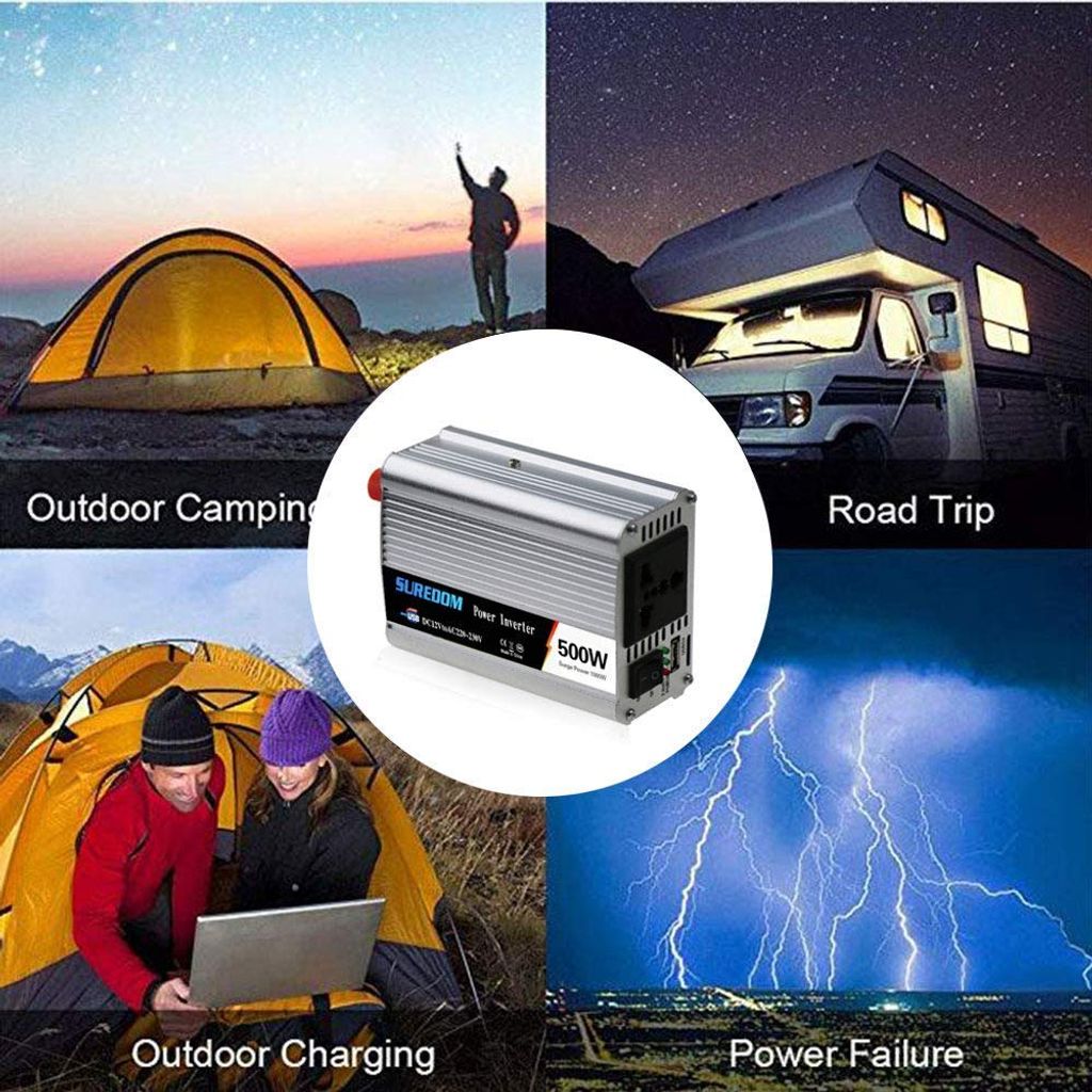Inversor de Corrente Automotivo 300W-500W-800W (potência contínua), DC 12V-24V para AC 110V-220V, com tomadas AC e portas USB para notebook (500W 12V→110V)